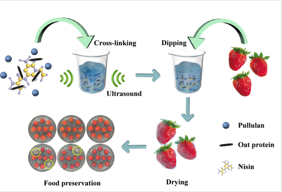 Oat protein has good film-forming properties and biodegradability. The films developed from oat protein alone have weaker barrier and mechanical properties than other proteins films, limiting their application in food packaging. In this study, pullulan polysaccharide was added to oat protein to prepare a protein-polysaccharide composite film to improve protein film's mechanical and barrier properties. At the same time, Nisin, a natural antibacterial agent, was added to enhance antibacterial activity of (Nis@Op/Pul film) composite film . Ultrasound was introduced to improve its mechanical, structural, and physicochemical properties. The ultrasound treatment significantly increased the elongation at break and transparency of Nis@Op/Pul film by 18.37% and 8.03% and decreased its total soluble matter and oxygen permeability by 8.33% 2.78%, respectively, compared to the conventional method. The structure analysis shows ultrasound enhances intermolecular hydrogen bonding, reduces the crystallinity, and forms a more stable, uniform surface. Moreover, the Nis@Op/Pul film prepared by ultrasound treatment could effectively delay the decay and deterioration of fresh strawberries and prolong their shelf life.