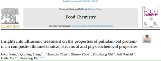 Professor Xiaofeng Ren, School of Food and Biological Engineering, Jiangsu University published a research paper recently entitled "Insights into ultrasonic treatment on the properties of pullulan/oat protein/nisin composite film:mechanical, structural and physicochemical properties" in the journal “Food Chemistry (Q1, IF: 9.231).” A graduate student of the year 2020, “Lixin Kang,” , is the first author of the paper; Professor Xiaofeng Ren and Dr. Qiufang Liang are the co-corresponding authors of the paper.