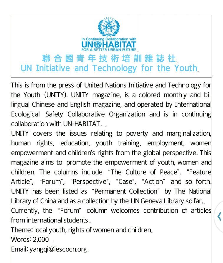 the Forum Column of UNITY Welcomes Contribution of Articles from International Students