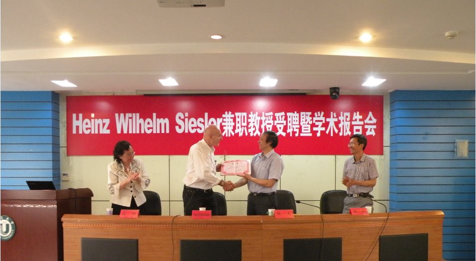 On Jun. 12, Heinz Wilhelm Siesler from University of Duisburg-Essen Visited Jiangsu University. Prof. Heinz Wilhelm Siesler was appointed part-time professor of Jiangsu University. At the ceremony, Chen Long, the vice President, granted prof. Heinz Wilhelm Siesler a letter of appointment, pinned a Jiangsu University emblem for him. After the ceremony, prof. Siesler made a lecture entitled The Near-InFrared Region, A Plea for an Under&#118alued Wavelength Range of Vibrational Spectroscopy.