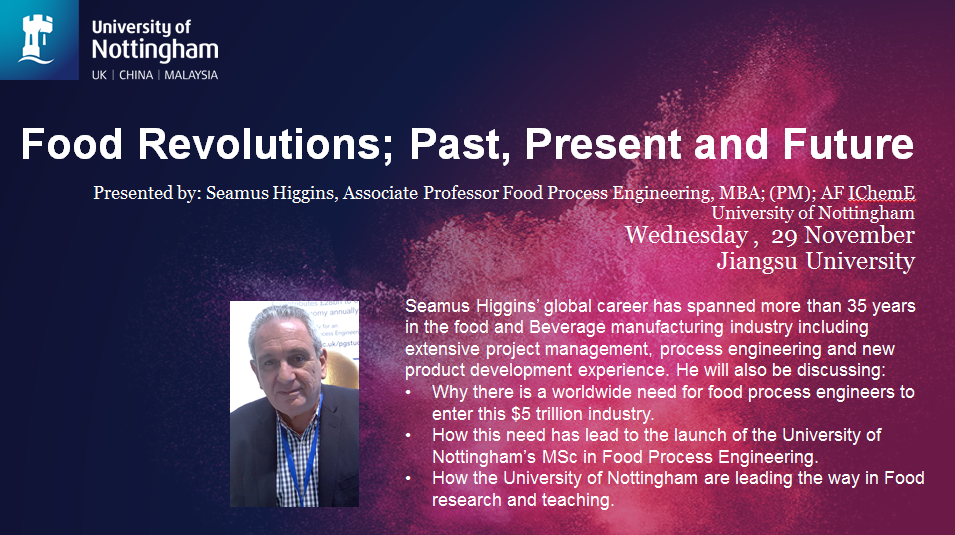 Dr. Seamus Higgins leads the development and marketing of a new MSc programme in food process engineering in the department of Chemical & Environmental Engineering, University of Nottingham.He has extensive project management, process management and new product development expertise acquired through a global career spanning more than 30 years in the food manufacturing industry. He has also worked and consulted for several leading global food companies, as well as entrepreneurs and new company start-ups.