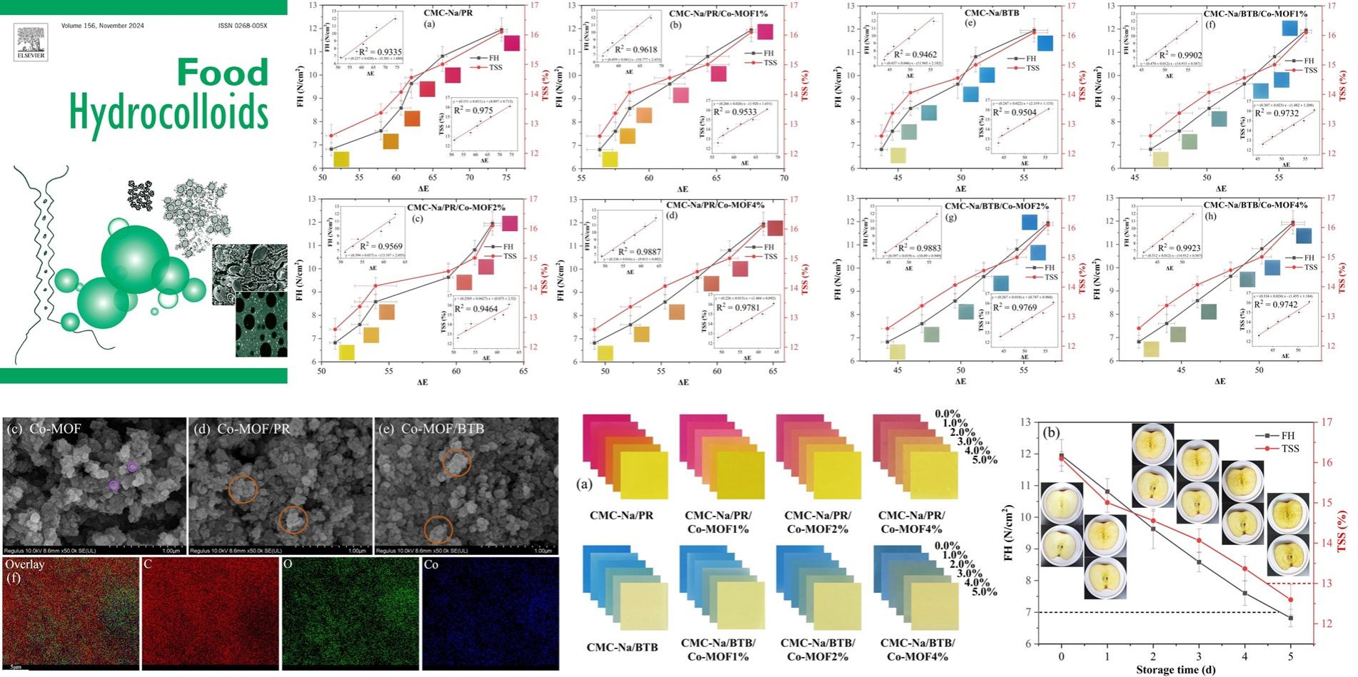 本文探讨了添加Co-MOF后CMC-Na基薄膜表现出优异的防水性、时间-温度稳定性和力学性能,揭示了多功能纳米Co-MOF填料在食品智能包装领域中的创新应用。值得注意的是,Co-MOF基复合膜表现出增强的紫外-可见光阻隔性、染料的抗迁移性能和热稳定性。最后,Co-MOF基薄膜的总色差值(ΔE)与鲜切富士苹果的硬度和总可溶性固形物(TSS)分别存在显著的线性响应(R2=0.9923和0.9781)。研究结果表明,含多功能MOF纳米填料的CMC-Na基复合膜作为可视化监测手段具有巨大应用潜力。