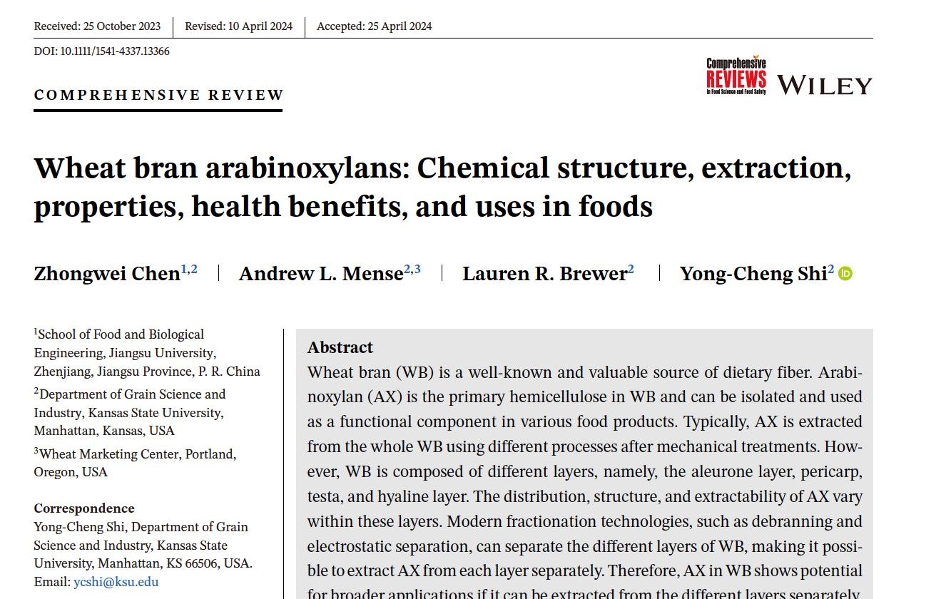 陈中伟副教授在国际食品领域顶级期刊Comprehensive Reviews in Food Science and Food Safety(Q1, IF=14.8)在线发表了标题为《Wheat bran arabinoxylans: Chemical structure, extraction, properties, health benefits, and uses in foods》的综述论文(DOI: 10.1111/1541-4337.13366)。陈中伟副教授为该论文的第一作者,美国堪萨斯州立大学Yong-Cheng Shi教授为通讯作者。不久前,陈中伟副教授已与Yong-Cheng Shi教授合作在Critical Reviews in Food Science and Nutrition(Q1,IF=10.2)发表《Wheat bran layers: Composition, structure, fractionation, and potential uses in foods》相关的论文。本论文是继上一篇关于小麦麸皮结构层的TOP期刊综述论文后,第二篇关于小麦麸皮细胞壁多糖的TOP综述论文。
