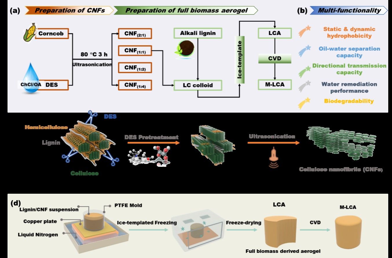 Figure 1 (a) Schematic of the experimental procedure for CNF isolation and fabrication of aerogels from full biomass, and (b) multi-functionality; (c) Schematic diagram of corncob fractionation using ChCl/OA-based DES and ultrasonication; (d) Schematic diagram of a hydrophobic full-biomass-derived aerogel prepared using a combination of the ice-templated freezing and CVD. 论文链接://doi.org/10.1016/j.cej.2023.146425