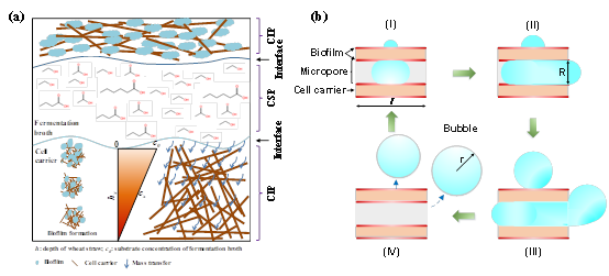 Fig.1. (a) Model of caproate fermentation system with biofilm formation (particle size 5-10 mm; CIP: cell immobilized part; CSP: cell suspended part) and (b) bubble formation on the surface and in the micropores of cell carrier (I: hydrogen production; II: formation of little bubbles; III: bubble growth; IV: escape of big bubble).