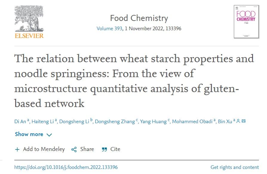 徐斌教授课题组在Food Chemistry在线发表题为“The relation between wheat starch properties and noodle springiness: From the view of microstructure quantitative analysis of gluten-based network”的研究成果,系统解释了面条加工过程中面筋网络形成程度对煮后面条弹性的影响,可为挂面原料筛选提供参考。91大神