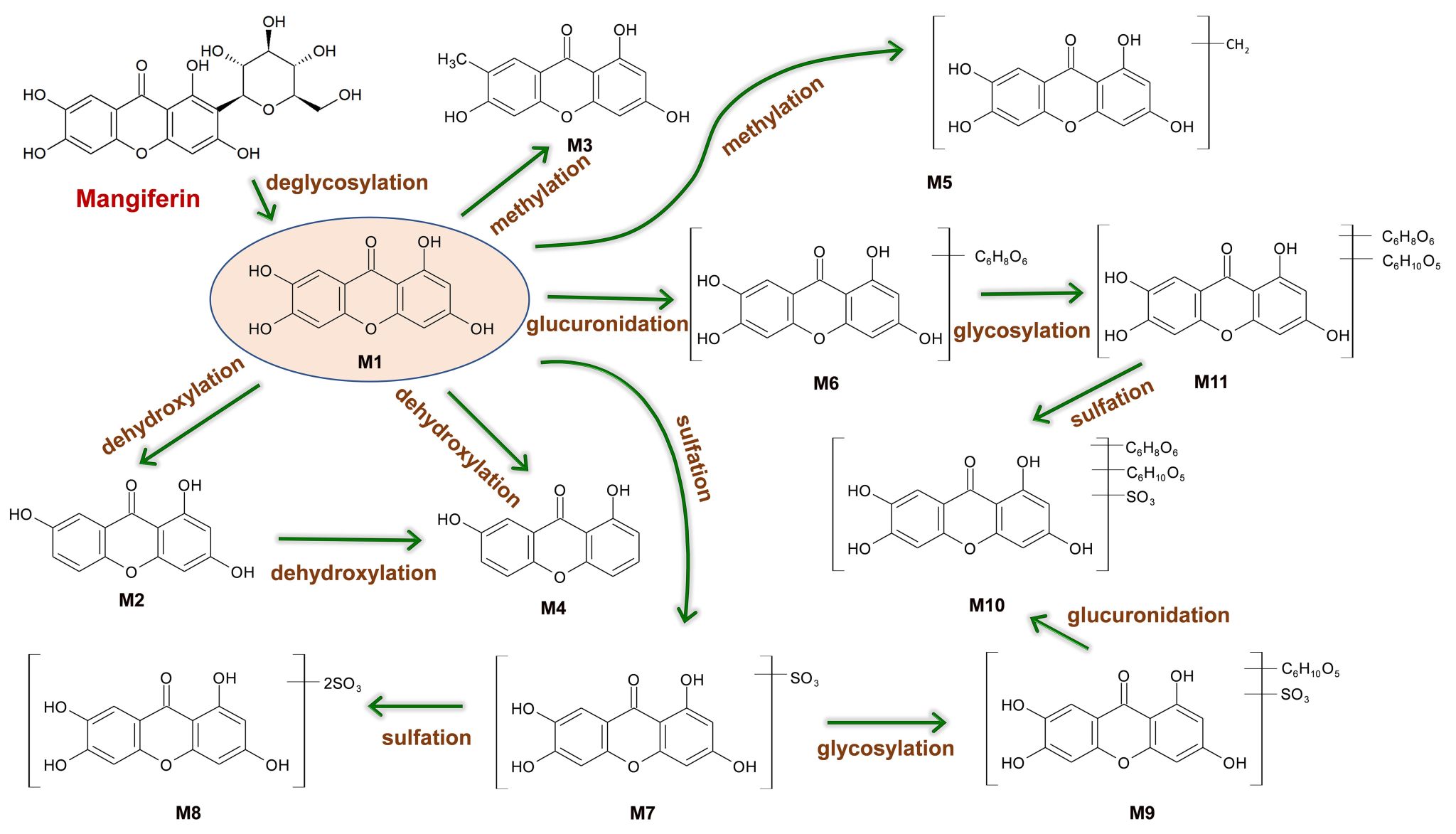 芒果苷广泛地分布在不同植物的根、茎、叶中,生长环境、发育阶段、收获季节、储藏方式等影响芒果苷的含量,了解其分布和影响因素对提高芒果苷的回收率提供了理论支持,并促进以芒果苷为主的营养或膳食补充剂的开发。芒果苷的吸收主要发生在小肠,通过被动扩散的方式进行,在胃肠道的不同区段的吸收能力不同。此外,还需要更多的研究来评估芒果苷的吸收代谢,其代谢物可能会影响芒果苷的生物活性。芒果苷的纳米颗粒、微粒化、成盐作用、与天然/合成化合物的络合以及与其他成分的联合给药,是提高芒果苷生物活性及其生物利用度的主要方法,并且大部分研究已申请专利。但是在开发出高可溶性和高生物利用度的天然健康产品或食品补充剂方面仍存在一些限制,例如成本高,产量低等。目前,芒果苷尚未作为一种广泛使用的临床药物,并且关于芒果苷临床疗效的文献有限,因此芒果苷的药代动力学和安全性评估需要进一步研究。