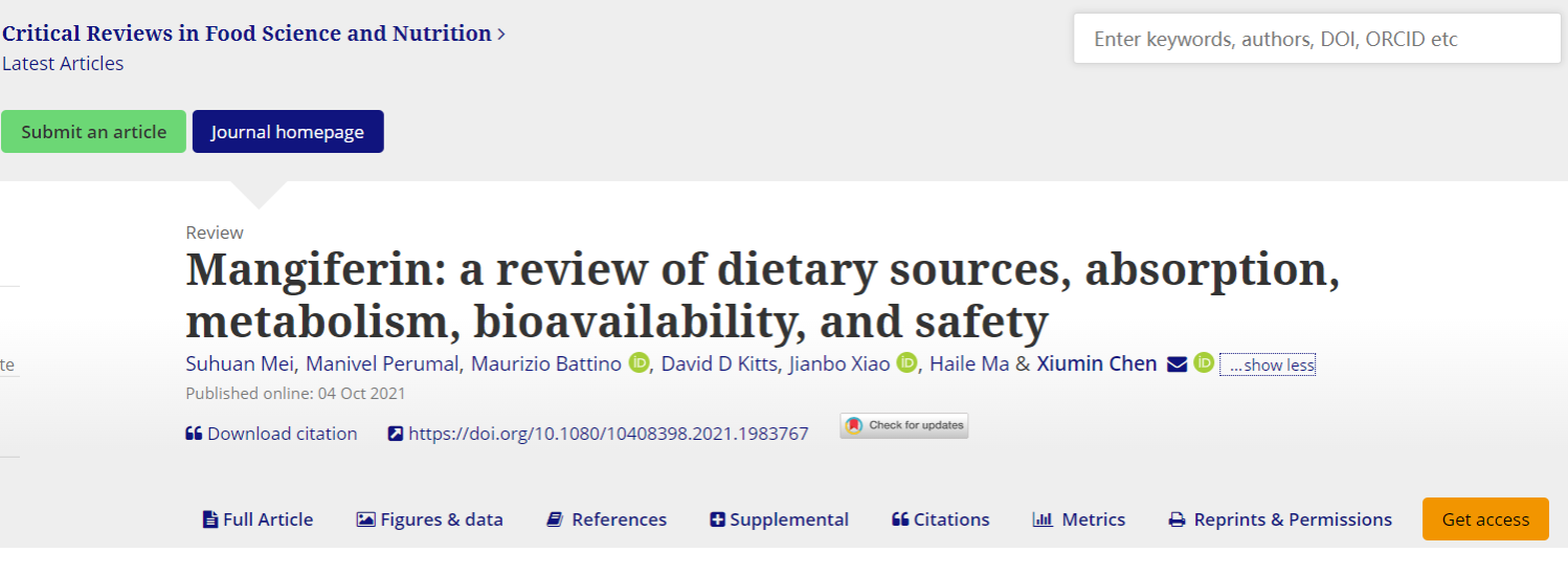 陈秀敏教授在国际食品领域顶级期刊Critical Reviews in Food Science and Nutrition在线发表题为“Mangiferin: a review of dietary sources, absorption, metabolism, bioavailability, and safety”的综述(//doi.org/10.1080/10408398.2021.1983767),介绍了近年来芒果苷在吸收代谢方面的研究进展以及提高芒果苷溶解度和生物利用度的最新方法,讨论了影响芒果苷在食品中含量的因素以及利用纳米技术和联合用药等提高芒果苷生物利用度等新型生物专利技术。该成果已被《食品加 智食科技》公众号(//mp.weixin.qq.com/s/nS363_2xdfajF5kKH9GAdA)推送,产生了较大的学术影响。本文的第一作者为91大神