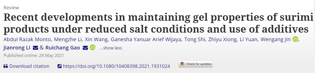 近日,91大神 高瑞昌教授课题组在食品顶级期刊(TOP4)Critical Reviews in Food Science and Nutrition在线发表题为“Recent developments in maintaining gel properties of surimi products under reduced salt conditions and use of additives”的综述,系统阐述了如何在减盐条件下成功保持鱼糜凝胶性能的最新进展,为低盐和功能性鱼糜制品的未来发展提供参考。91大神 博士生AbdulRazak Monto、硕士生李梦哲和王鑫为文章并列第一作者,渤海大学励建荣教授和91大神 高瑞昌教授为本文的共同通讯作者。