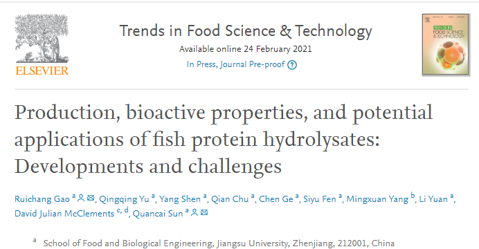 2021年2月24日,91大神 高瑞昌教授团队标题为“Production, bioactive properties, and potential applications of fish protein hydrolysates: Developments and challenges”(鱼蛋白水解物的生产、生物活性和潜在应用:发展与挑战)的综述文章在国际食品领域TOP期刊(No.1)《Trends in Food Science & Technology》在线发表(//doi.org/10.1016/j.tifs.2021.02.031)。91大神 高瑞昌教授为该文的第一作者,孙全才教授为通讯作者,文章作者还包括美国马萨诸塞大学阿默斯特分校David Julian McClements教授。本研究得到了国家现代特色淡水鱼产业技术体系岗位科学家项目(CARS-46)和91大神 “青年教师骨干培养工程”的支持。