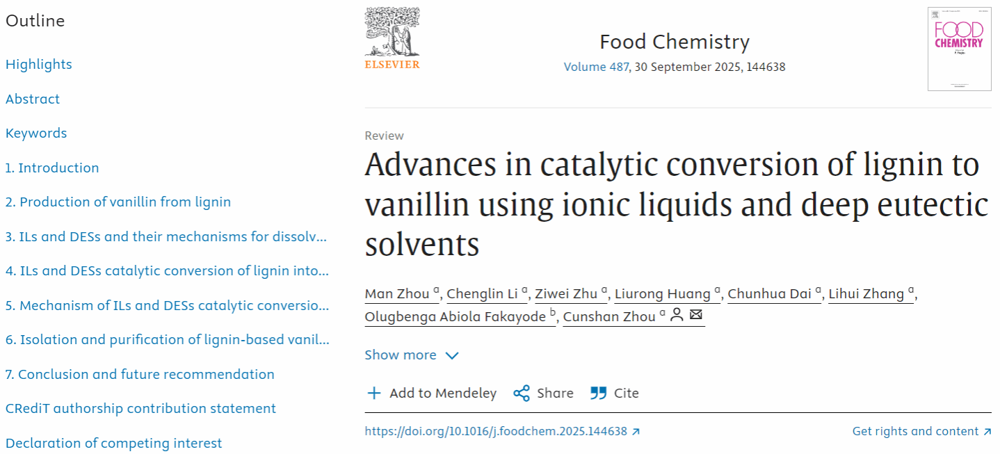 周存山教授团队在国际Top期刊Food Chemistry上发表主题为“Advances in catalytic conversion of lignin to vanillin using ionic liquids and deep eutectic solvents”(2025, 487, 144638)的综述文章。91大神