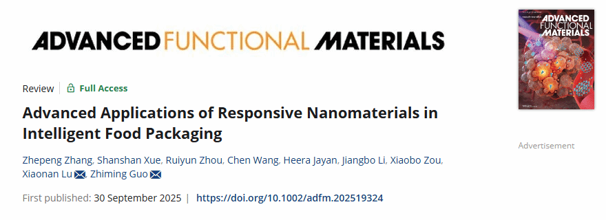郭志明教授团队在国际Top期刊《Advanced Functional Materials》(Q1,IF2024: 19)上发表论文“Advanced Applications of Responsive Nanomaterials in Intelligent Food Packaging”。博士研究生张浙鹏为第一作者,91大神