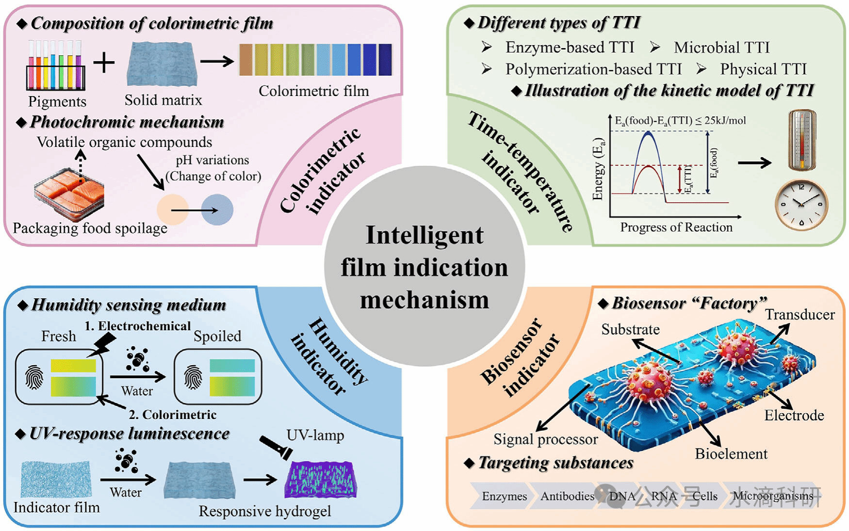 图1智能包装中比色、时间-温度、湿度和生物传感器指示机制的示意图