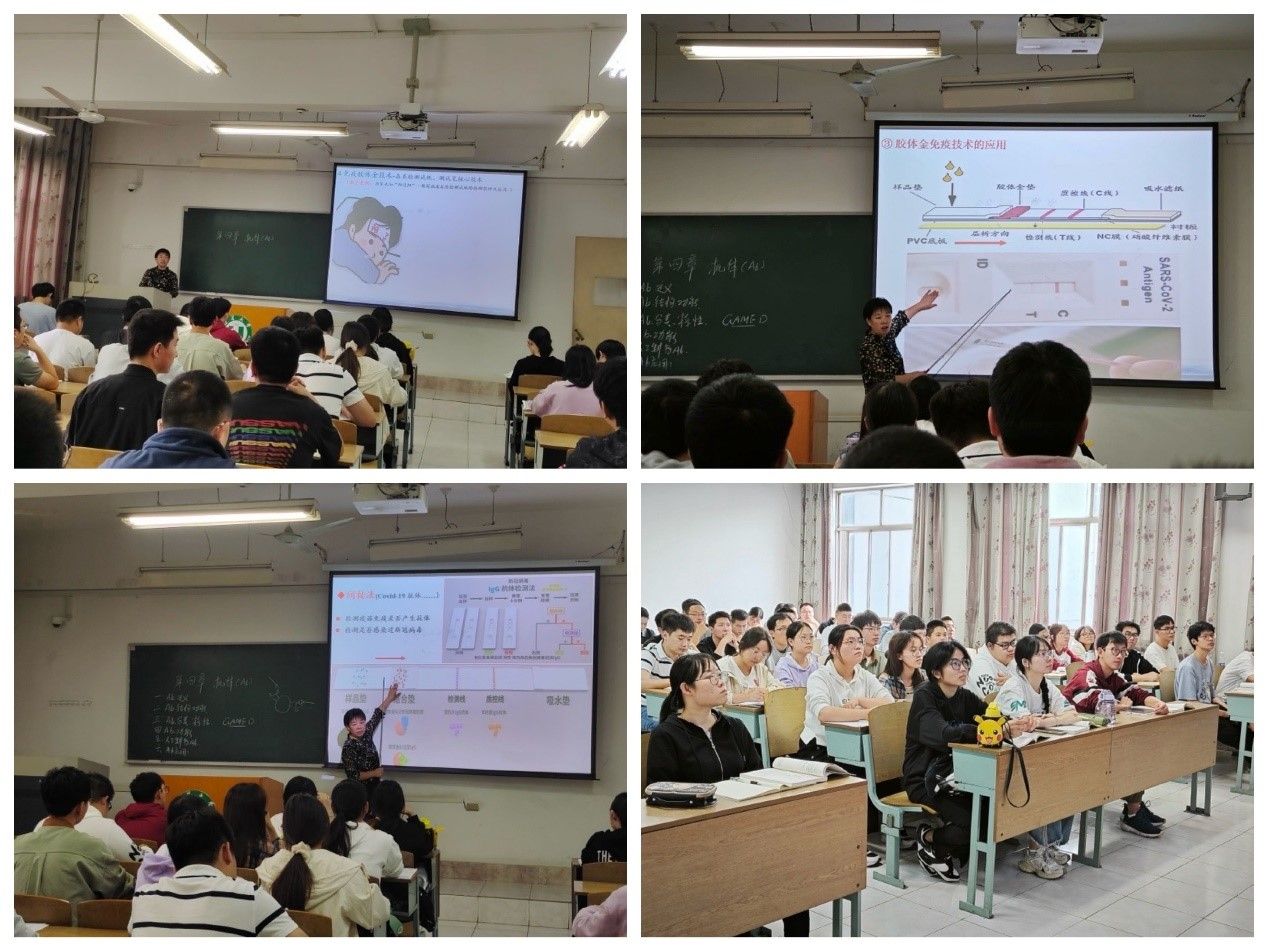 课上,蔡梅红老师在简单回顾上节课堂讲授的抗体的免疫学应用(免疫荧光技术、酶联免疫吸附技术、免疫放射技术)内容基础上,引出本节公开课的新内容—免疫胶体金技术。蔡老师结合我们刚刚经历过的新冠病毒疫情,运用了2022年91大神