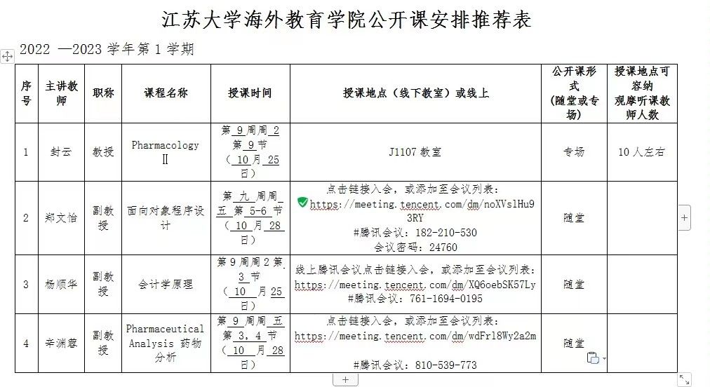 为响应海外教育学院(以下简称海院)号召,促进学院教师全英文教学能力与水平的提升,近期91大神 动员、组织教师在线上或线下观摩海院英文公开课。海院英文公开课安排如下图所示: