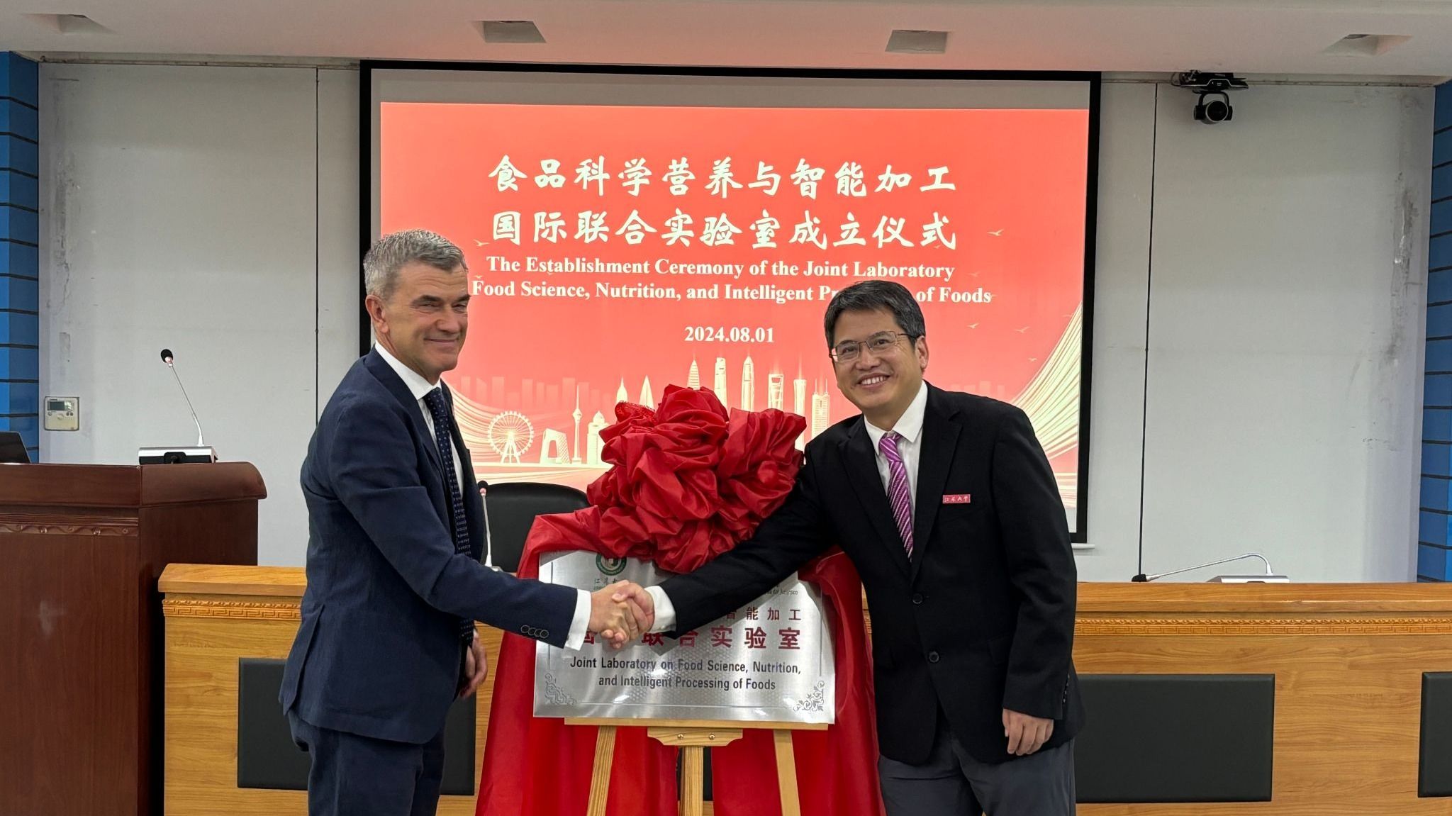 邹小波与Maurizio Battino对食品科学营养与智能加工国际联合实验室进行揭牌。邹小波对食品科学营养与智能加工国际联合实验室的成立表示祝贺,对外国专家的到来表示热烈的欢迎,希望国际联合实验室能够切实发挥作用,积极创新作为,为我校与海外高校开展合作与交流架起桥梁。