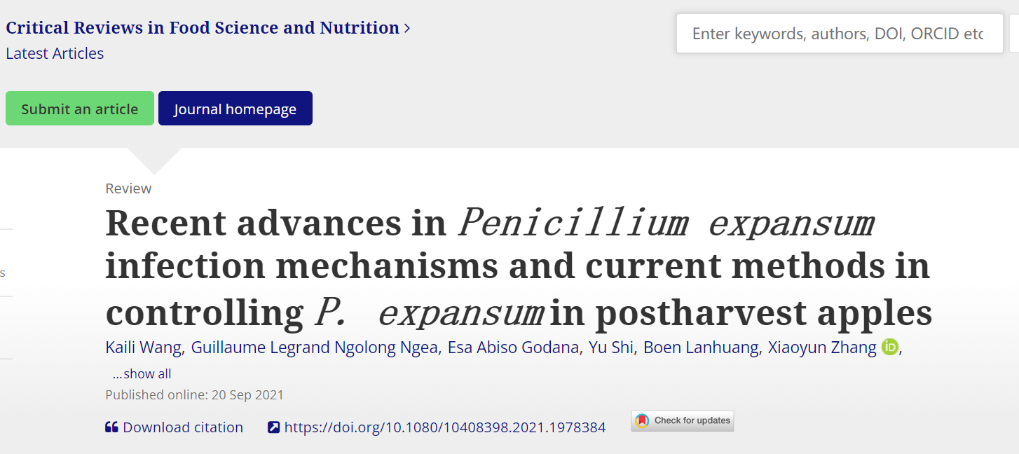 张红印教授在国际食品领域顶级期刊CriticalReviews in Food Science and Nutrition(IF 11.176)在线发表题为“Recent advances inPenicillium expansuminfection mechanisms and current methods in controllingP. expansumin postharvest apples”的综述(//doi.org/10.1080/10408398.2021.1978384),系统阐述了扩展青霉侵染苹果的分子机制及其防治策略方面的最新研究进展。该成果已被《食品科学》公众号(//mp.weixin.qq.com/s/QBqj537ULx_Fqoum3V7PvA)推送,并被食品科学网(//www.chnfood.cn/7293.html)、新浪微博等媒体广泛报道,产生了较大的学术影响。本文的第一作者为91大神