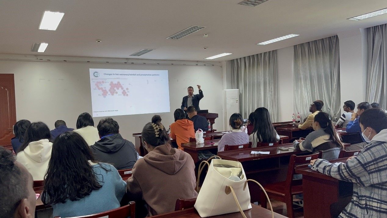 Angel Medina Vaya教授针对气候变化对亚洲范围内真菌、真菌毒素、食品和饲料安全的影响进行了报告。首先介绍了近些年全球气候变化对环境的影响,尤其是温室气体和温度的变化对环境的影响;着重介绍了气候变化对主要粮食(水稻、玉米和小麦)产量和粮食真菌污染的影响,从而以玉米主要真菌黄曲霉产的黄曲霉毒素为主要研究对象,在实验室条件下,研究了水分活度、温度和CO2对黄曲霉产黄曲霉毒素的含量的影响,从而寻找相应的生物控制方法的研究成果。Angel Medina Vaya教授的报告内容丰富,深入浅出,热情洋溢,引人入胜。报告结束后,Angel Medina Vaya教授与参会师生进行了热烈的讨论。